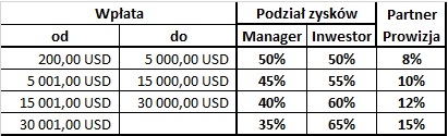 Wynagrodzenie za Państwa poleconych jest wypłacane przez cały czas trwania inwestycji a procent uzależniony od wielkości jego wpłaty. Jeżeli pozyskany inwestor w trakcie dopłaci, bądź zrobi wypłatę to jeżeli wejdą Państwo w inny próg % to dostaną Państwo wg tego progu więcej bądź mniej dolarów.